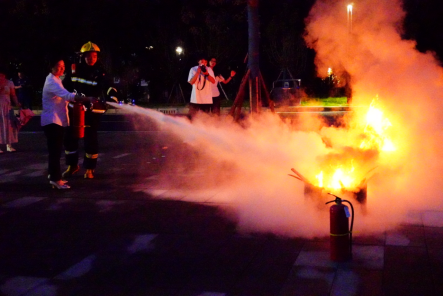 疏散集结完成后,进入灭火实操教学环节。南川区消防救援支队教官向新生详细讲解不同类型灭火器的适用场景、操作要点及注意事项,并现场示范灭火器使用方法。随后,南川校区管委会新生、食堂、物业工作人员轮流上前进行灭火实操,教官在旁逐一指导,纠正不规范动作,确保掌握正确的灭火技能。